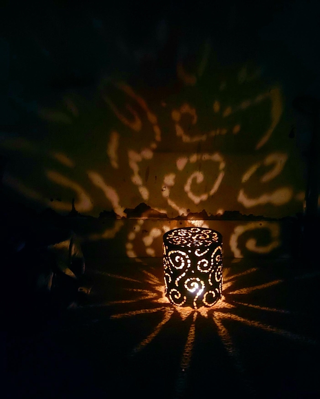 handgemacht Unikat, mit  Zauberhaftem Schattenwurf. Die Dose hat auch Muster im Boden und kann daher sowohl oben offen oder unten offen aufgestellt werden.  ( Achtung wird heiss wenn man sie Kopfüber aufstellt) Lieferung erfolgt ohne Kerze